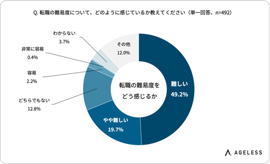 3. これからも働きたい一方、ミドル・シニア世代の転職について「難しい」「やや難しい」と感じている人は約7割、その背景に、「年齢による採用ハードル」を感じる人が7割超