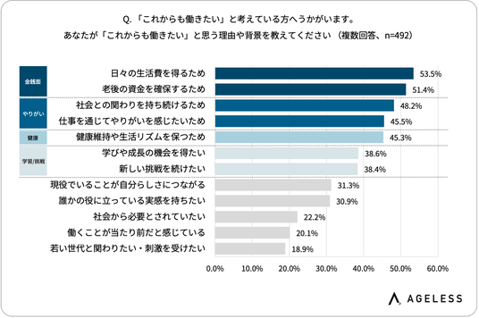 - これからも働きたい理由は「日々の生活費を得る/老後の資金を確保するため」が5割超、「社会との関わりを持ち続けたい」「仕事を通じてやりがいを感じたい」が4割超
