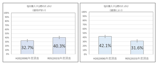 「塩を購入するきっかけ」の質問では、「値段が安い」が伸びており、値段が重視されるようになってきていることが伺えます。一方で「健康に良い」は、減少しています。