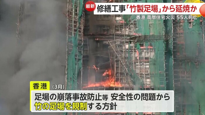 香港では2025年3月、足場の崩落事故防止などの安全性の問題から、竹の足場を規制する方針を打ち出した。今回の火災は、政府が徐々に竹から金属製の足場を増やしていく移行期間中に起きた。