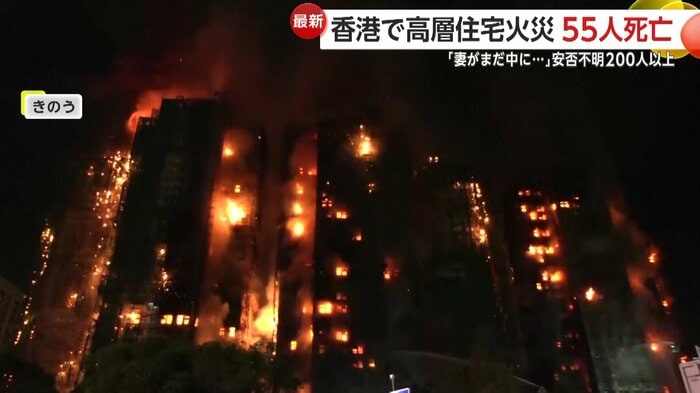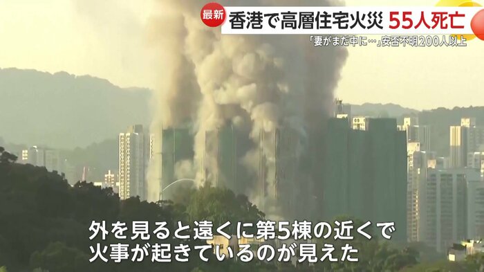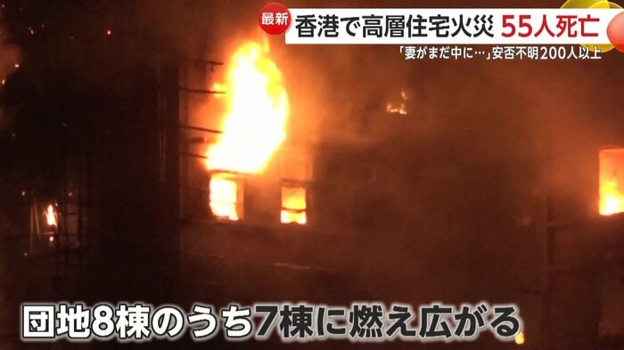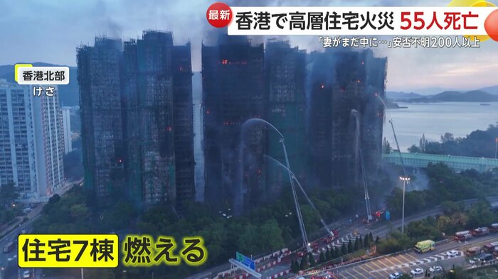 香港北部の高層住宅団地で26日、大規模火災が発生し、少なくとも55人が死亡、200人以上と連絡が取れていない。火は8棟中7棟に燃え広がり、依然、鎮火のめどが立っていない。