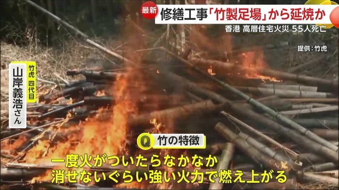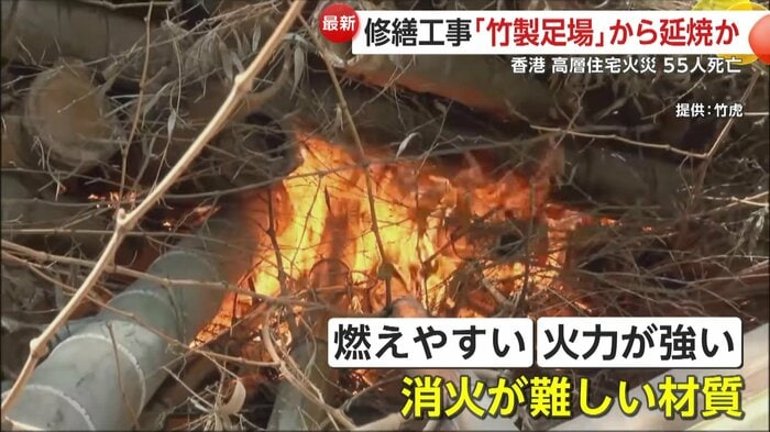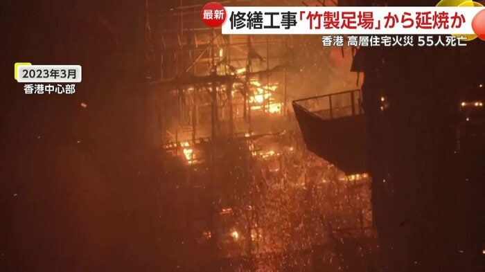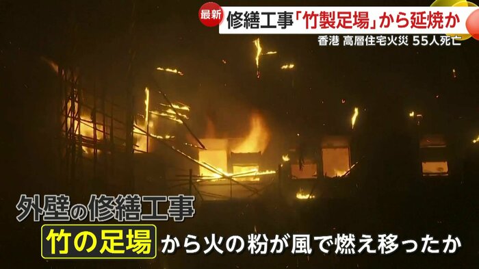 出火当時、現場では外壁の修繕工事が行われていて、香港では「竹の足場」が使われることが多く、地元メディアは、この竹の足場から火の粉が風で燃え移ったとの見方を伝えている。