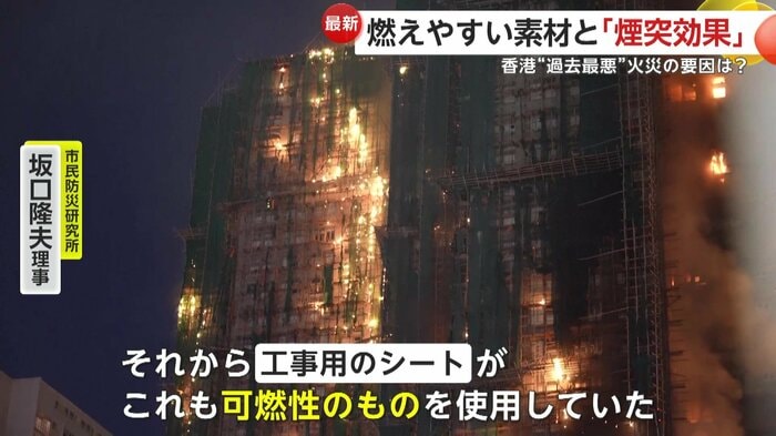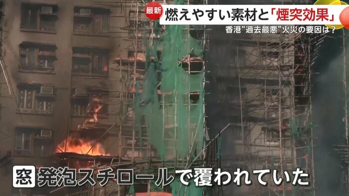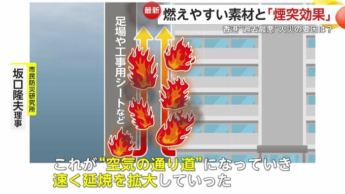 修繕工事中の竹製足場や可燃性シートが延焼拡大の要因とみられている。専門家は、燃えやすい素材で建物が覆われていたことで、さらに「煙突効果」といった現象が発生し、火が瞬く間に燃え広がった可能性を指摘する。