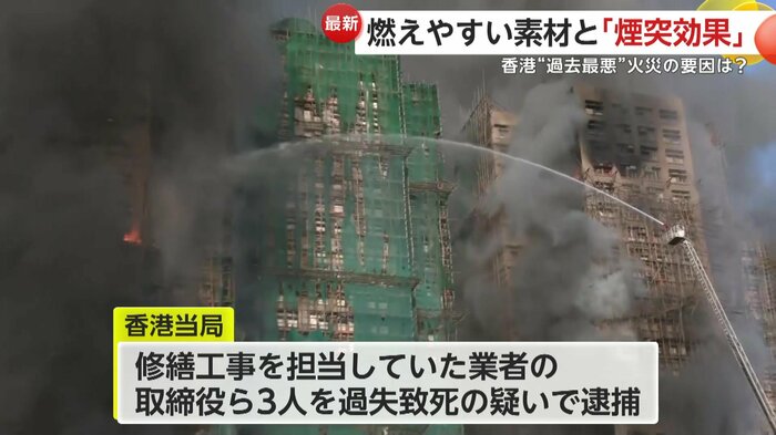 香港当局は、修繕工事を担当していた業者の取締役ら3人を過失致死の疑いで逮捕したと発表。会社を家宅捜索した。
