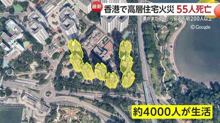 香港北部の海沿いに立つ高層住宅の団地で発生した大規模火災は、住宅7棟に燃え広がり、現場には黒焦げとなった高層住宅が建ち並ぶ異様な光景が広がっていた。