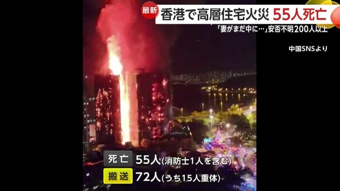 消防によると、この火災で少なくとも55人が死亡し、香港で起きた建物火災として過去最悪の被害となった。