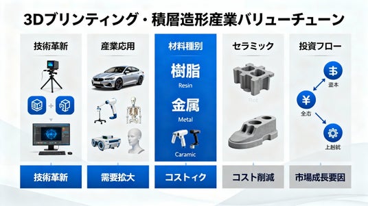 産業用途の拡大は従来の製造業領域を大きく超えている。金属・合金を用いた航空宇宙産業、自動車産業、医療機器産業から始まり、セラミックの高温応用や光学応用、複合材による軽量構造、建設分野向けのコンクリート3Dプリント、そして先端医療、再生医療、遺伝子工学といった多様な領域まで、実に45を超えるセクターで急速に用途が拡大している。