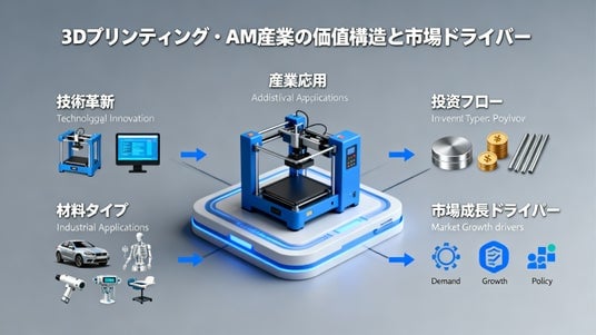 本産業を特徴づけるのは、単一の技術革新ではなく、複数の異なる領域で革新が同時進行しているという状況である。AI技術とデジタルツイン技術との連携により、自律型AMシステムと完全自動化システムの実現が急速に現実味を帯びてきた。かつての産業ロボットのような単純な自動化ではなく、AIが製造プロセスを最適化し、リアルタイムデータに基づいた意思決定を行うスマート製造への転換が急速に進んでいる。