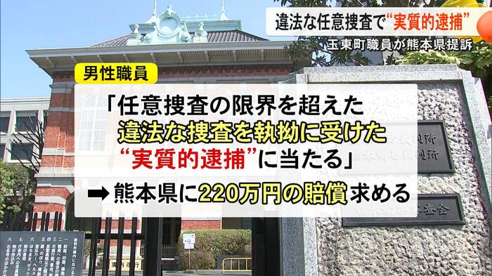 熊本・玉東町が発注した工事をめぐり、官製談合防止法違反の疑いで警察から捜査を受けていた町の職員が、「『実質的逮捕』に当たる違法な捜査を受けた」として、熊本県に対し損害賠償を求める裁判を起こしたことが分かった。熊本県警は「訴状を精査中でコメントを差し控える」としている。