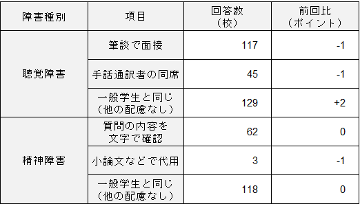「手話通訳者」や「パソコン通訳者」の同席を実施する大学も一定数ありますが、どちらも「筆談」の半数以下にとどまっているのは残念です。さらに、「一般学生と同じ」のみを選択し他の配慮を行わない大学が129校あり、前回比で2ポイント増えています。面接試験では円滑なコミュニケーションが基本であり、そのための支援は大学が主体的に提供すべきです。