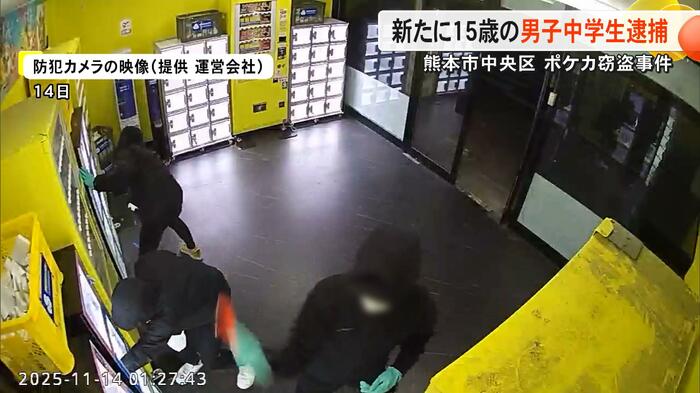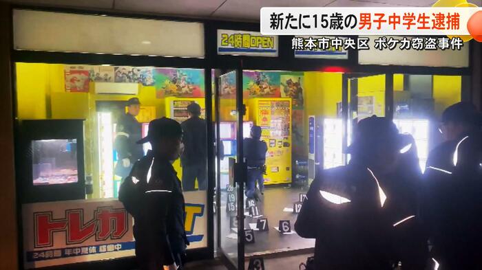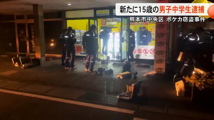熊本市中央区のポケモンカード販売店に侵入し、約15万3000円相当のカード1箱を盗んだ疑いで、高校生を含む男5人が逮捕された事件で、警察は11月27日に15歳の男子中学生を新たに逮捕した。