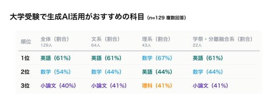 - 今高校生や受験生だったら生成AIツールを受験のために「頻繁に」または「時々」使用したい、と回答したのは62%。実際の大学入試において生成AIツールを「頻繁に」または「時々」使用した、と回答したのは37%だった。生成AIの利用率自体が年々上昇していること、また大学生活で活用した経験によって、活用意向が高まっていると考えられる。- 生成AIを実際に活用した科目TOP3、今受験生だったら使いたい科目のTOP3は、どちらも1位「英語」2位「数学」3位「小論文」であった。英語は文系・理系どちらも必要な科目であることから1位となった。現在、文系学部に通う学生が約5割いたが、それでも数学が2位にランクインしており、数学の学習中のサポートに対するニーズの高さがうかがえた。