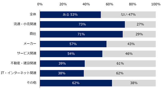 業種別では「流通・小売関連」が73%、「商社」が71%で7割を上回りました。一方で「IT・インターネット関連」は38%で、6割が転勤なしという結果になりました。