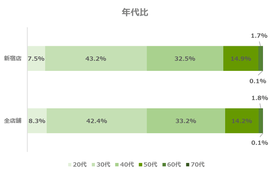 女性は20代の割合はやや低いものの、30~40代の割合が高い点は全店舗と同様の傾向です。