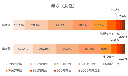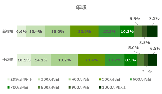 年収500万円台以上のすべての年収帯において、新宿店の割合が全店舗を上回っています。特に女性は年収600~900万円台の割合が全店舗と比較して高いことから、都心で高い年収とキャリアを築いている女性が結婚相談所での効率的かつ質の高い出会いを求めていることがわかります。