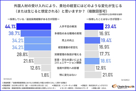 さらに、採用している/過去採用経験がある企業では、外国人受け入れによって「人手不足の解消」「職場の多様化」「売上向上」「経営基盤の安定化」といった経営面での変化を実感、あるいは想定している企業が多く、単なる労働力確保にとどまらず、経営の安定化や組織の活性化にも寄与していることが示されました。