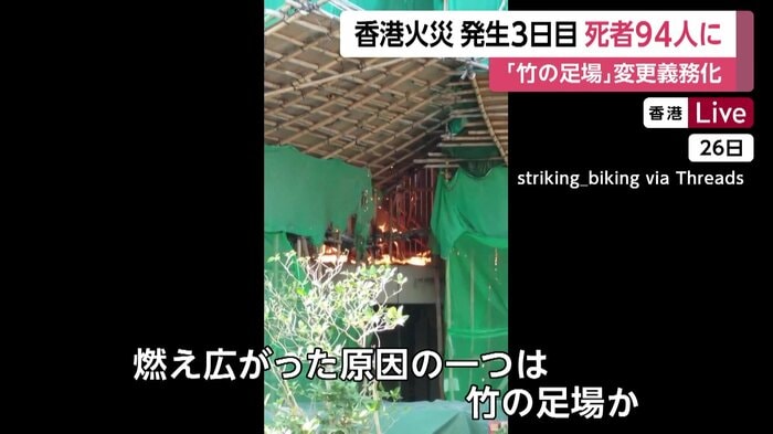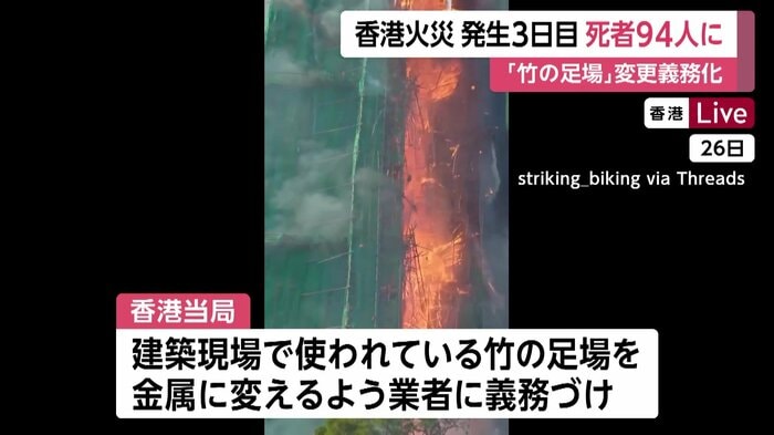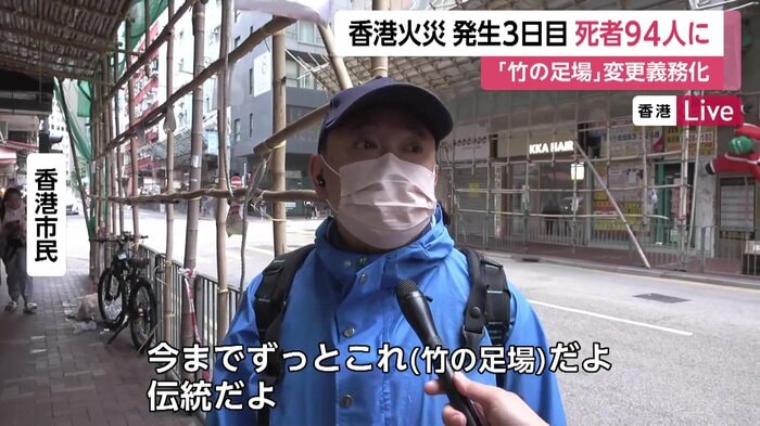 今回の火災を受けて香港当局は、香港の建築現場で伝統的に使われている竹の足場を金属に変えるよう業者に義務づけることを決めた。