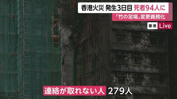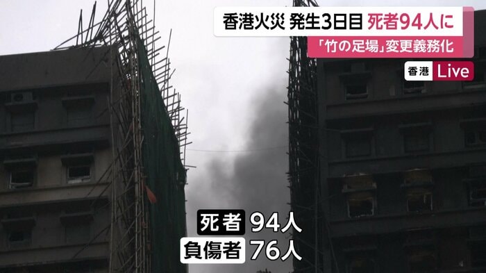 香港の高層住宅で発生した大規模火災は発生から3日目を迎え、死者の数は94人となった。