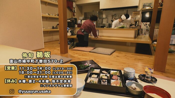 富山市婦中町の静かな住宅街に今年4月にオープンした「侑旬鵜坂」。趣のある玄関を抜けると、全席小上がりの落ち着いた和の空間が広がっている。約15席という小規模ながら、丁寧な料理とサービスで訪れる人を魅了している。