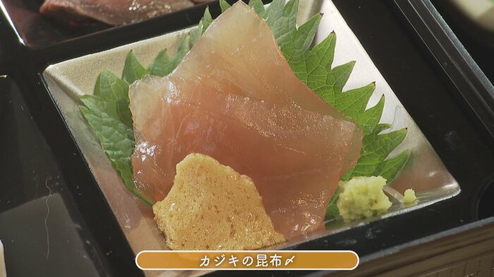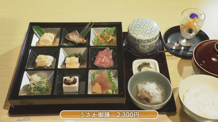 メインの御膳は9品もの料理が美しく盛り付けられ、見ているだけで楽しくなる豊かな内容だ。富山らしさを感じられる「カジキの昆布締め」は泡醤油とともに提供され、昆布締めならではのモチモチとした食感が楽しめる。