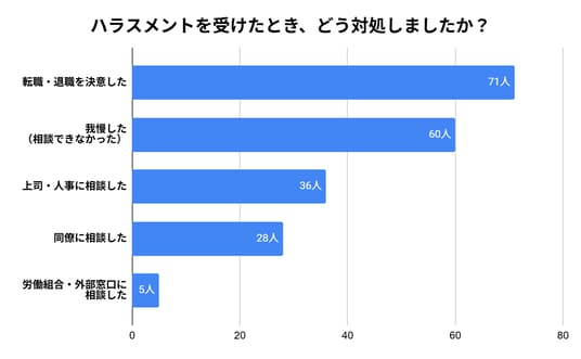ハラスメントを受けた際の対処としては、耐えるか退職するかの選択が多くを占める結果となりました。