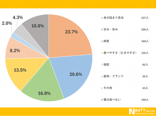 蟹を食べる際に重視するポイントについては、「身の詰まり具合」が23.7%と一番多く回答を頂きました。2番目は「甘み・旨み」が20.6%、3番目は「鮮度」が16.9%と続いています。