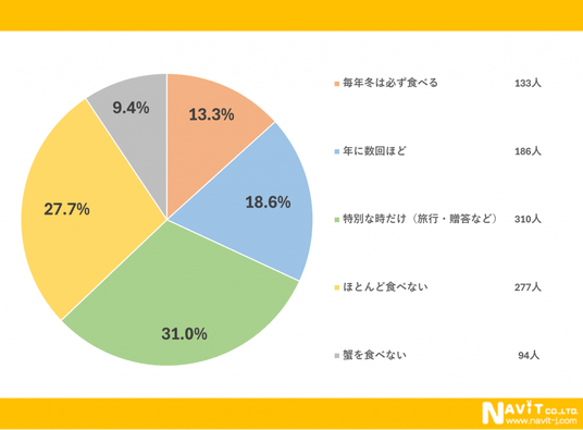 蟹を食べる機会についてのアンケートでは、「特別な時だけ(旅行・贈答など)」が1番多く31.1%で、「年に数回ほど」が18.6%で続くという結果になりました。ちなみに筆者は年に1回程度食べます。