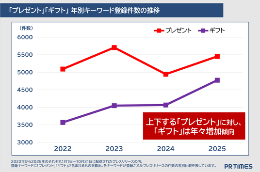 そして、例年から安定して上位にある「プレゼント」と「ギフト」は、いずれも新商品の利用シーンの一つに提案することを目的に、発売の発表に際して使用されてきました。順位では大きく変化がないように見えますが、件数を見ると変化が見られます。「プレゼント」が2022年:5091件、2023年:5707件、2024年:4945件、2025年:5452件と上下する中、「ギフト」はが2022年:3568件、2023年:4047件、2024年:4066件、2025年:4773件とその差を徐々に縮めるように右肩上がりを続けています。