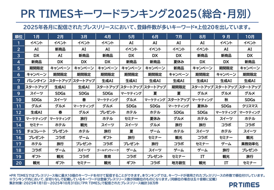 「PR TIMES」ではプレスリリース発表の際に、発表企業がプレスリリース内容に関係するキーワードを最大10個登録することができます。2025年1~10月に発表された総計38万2296件のプレスリリースのキーワード登録総数は46万7010種に上りました。件数による順位だけでなく、過去の件数との比較や月別の推移、キーワードごとの詳細な発表内容の分析から、2025年の企業活動の潮流や企業動向の変遷と流行の兆しをキーワードを通して分析しています。