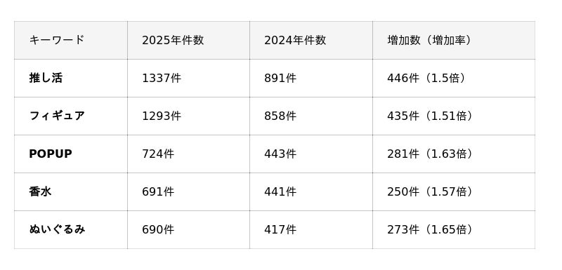 「推し活」が流行語として広く知れるようになった2021年末以降、企業発表で使用されるシーンも年々増えています。2021年:46件、2022年:312件、2023年:618件、2024年:891件。その勢いはとどまるどころか、新たな行動様式としてより一般的になっています。2025年も前年比+446件で1.5倍に増加しています。その対象や形式とともに、関連するキーワードも広がっており、「フィギュア」や「ぬいぐるみ」に加え、推し活対象をイメージしたという「香水」なども多く発売され、件数を伸ばしました。関連して、「ぬい活」のキーワードも2024年17件から53件と3.12倍に増加しています。