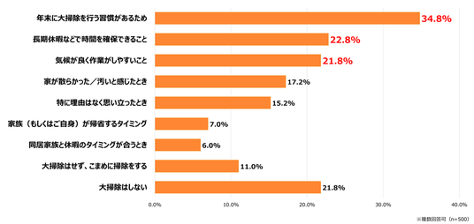 大掃除を行う時期の選び方について尋ねたところ、「年末に大掃除を行う習慣があるため」が34.8%で最も多い結果となりました。