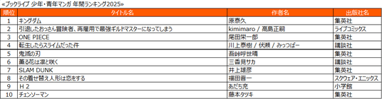 TOPPANホールディングス株式会社のグループ会社である、株式会社BookLive(本社:東京都港区・代表取締役社長:淡野 正)は、運営する総合電子書籍ストア「ブックライブ」にて、集計期間中の売上をもとにランキング化した「年間ランキング2025」を、本日11月28日(金)に発表しました。(集計期間:2025年1月1日~2025年11月6日)