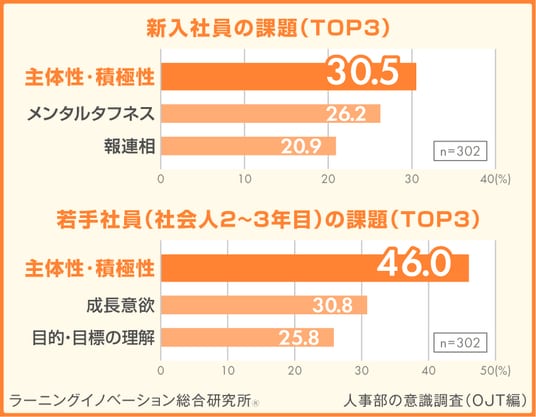 近年、少子高齢化や人材の流動化、働き方の多様化といった社会的な変化を背景に、企業は社員一人ひとりの力を最大限に引き出す組織づくりを求められています。特に、社員が自ら考え、行動する「主体性」は、イノベーションの創出や業務の自律的な推進に不可欠な要素です。その一方で、当社の調査結果*では、人事担当者にとって、新人・若手社員の最大の課題が「主体性・積極性」でした。