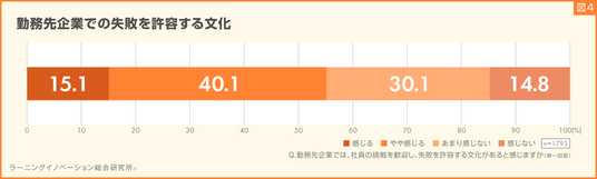 次に、勤務先企業では、社員の挑戦を歓迎し、失敗を許容する文化があると感じるかを質問しました。結果、「感じる」と回答した割合は15.1%、「やや感じる」と回答した割合は40.1%となりました(図4)。