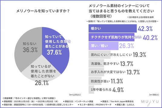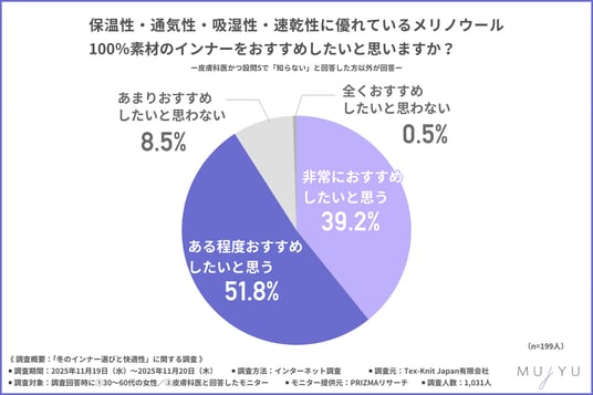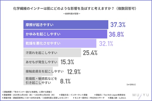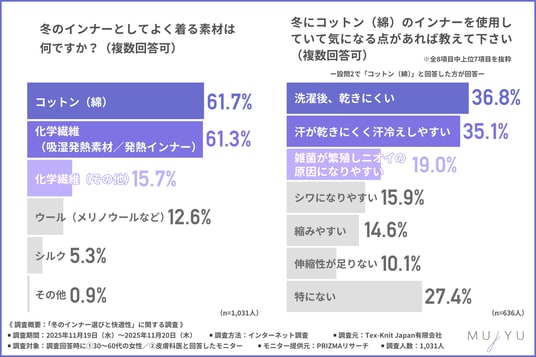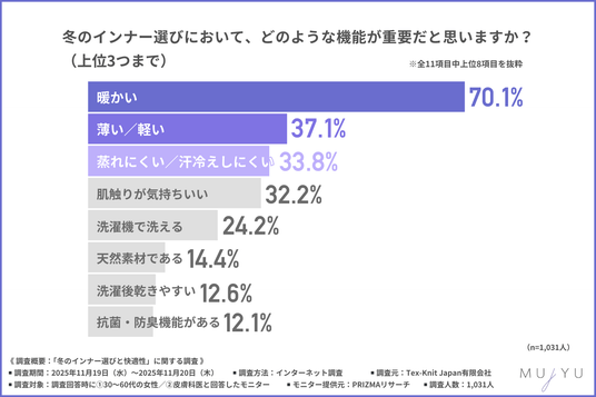 そこで今回、素材にこだわったインナーブランド『MUjYU』を展開するTex-Knit Japan有限会社(https://mujyu.jp/)は、1.30~60代の女性/2.皮膚科医を対象に「冬のインナー選びと快適性」に関する調査を行いました。