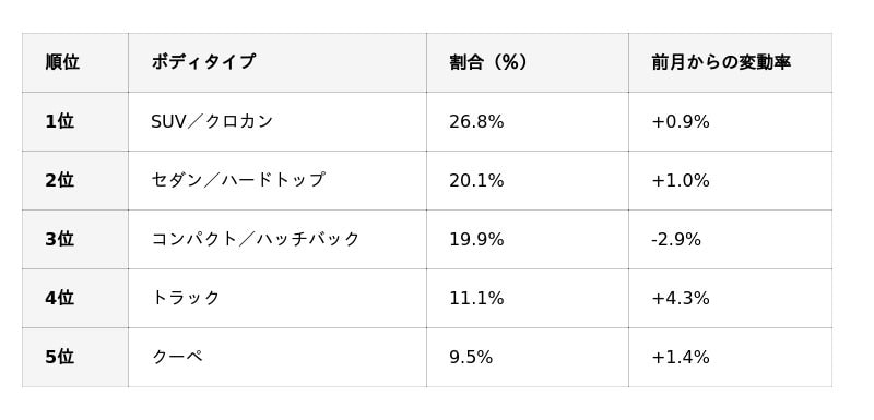 国産車ボディタイプ別買取ランキングは、1位の軽自動車から5位のセダン/ハードトップまで前月と同様。全体における各ボディタイプの割合も前月ほぼ変わらず、人気を反映したランキングとなっています。