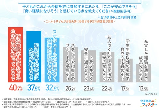 「子どもがこれから合宿免許に参加するにあたり、『ここが安心できそう』『良い経験になりそう』と感じている点」について尋ねたところ、『宿泊施設や食事などの生活環境が整っていそう(40.7%)』『短期間で効率的に免許が取れそう(37.9%)』『スケジュールが無理なく健康的に過ごせそう(32.9%)』が上位を占めました。