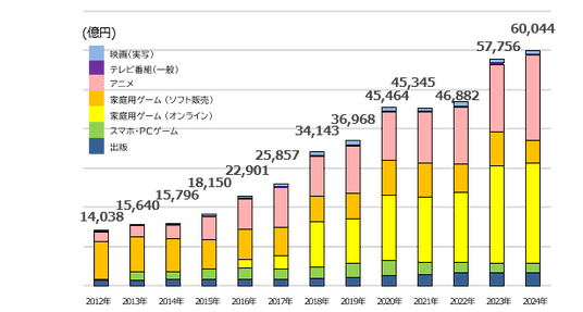 2024年、日本のコンテンツ7分野の海外売上の合計は約4%拡大し、6兆円を超えた。海外から日本への収入は約3.4兆円だった。算出した分野は映画(実写)、テレビ番組(一般)、アニメ(劇場・放送・配信等の映像と商品化ライセンス含む)、家庭用ゲーム(ソフト販売/オンライン)、スマホ・PCゲーム、出版(マンガを主とする)。アニメの海外売上が前年比26%の大幅増の約2.2兆円となり、全体の拡大を支えた。