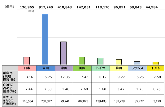 国民1人当たりの年間消費額は、米、英、韓、独に次いで日本、米国の40%以下、英国のおよそ半分だった。