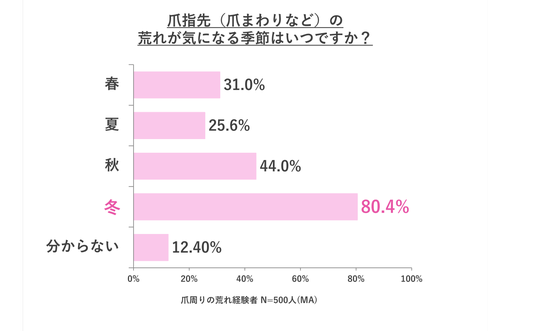 本調査によると、冬場は約8割の人が手・指先の荒れに悩む季節であることが判明しました。また、指先の荒れ・意識については、年代間・性別間でギャップもあることが分かりました。