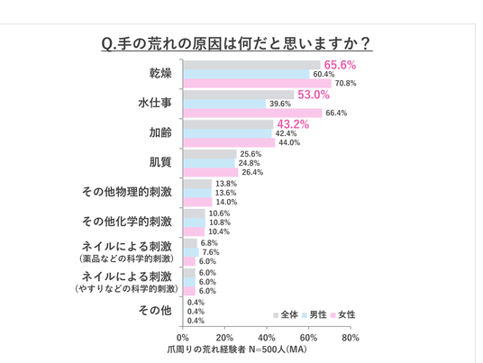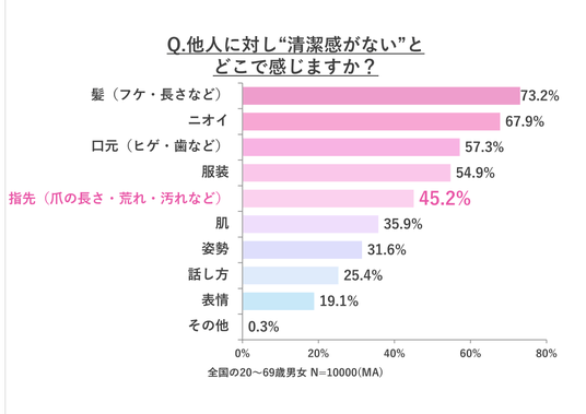 1.他人の指先で気になるところは、男女ともに「皮膚の荒れ」が最多 指先の印象はその人の印象にも関わる「指先の身だしなみ」が重要!他人の指先で気になるところとして挙げられた中では、爪のデザイン性や形、ツヤ、長さなどの要素ではなく「皮膚の荒れ」が男女共に最も多い結果となりました。女性はジェルネイルやマニキュアなどでデザイン性等を求める人が一定層いるものの、皮膚の荒れに関しては多くの人が関心を持っていることが分かりました。
