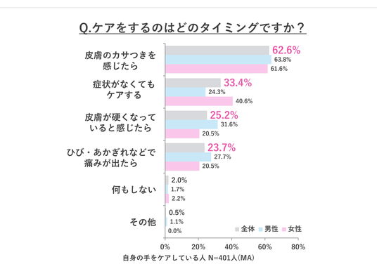 手のひらや甲の手荒れの原因は、上位から「乾燥(65.6%)」、「水仕事(53.0%)」、「加齢(43.2%)」という結果になりました。男女別で見ると「水仕事」は男性39.6%、女性66.4%と、原因によっては性別で大きく差が開くものもありました。同じく手のひらや甲をケアするタイミングについては、上位から「皮膚のカサつきを感じたら(62.6%)」、「症状がなくてもケア(33.4%)」、「皮膚が硬くなってきていると感じたら(25.2%)」、「ひび・あかぎれなどで痛みがでたら(23.7%)」という順に。男女別でみると、女性は予防的に、男性は支障が生じたらケアする傾向にあることが判明しました。