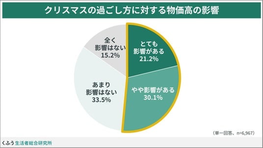 物価高による節約志向について、今年のクリスマスの過ごし方に「とても影響がある」(21.2%)、「やや影響がある」(30.1%)を合わせた約半数が「影響がある」と感じていることがわかりました。