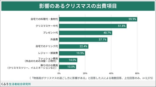 「影響がある」と回答した人に節約志向が影響しそうな支出項目を聞いたところ、自宅でのクリスマスの食卓に関する「料理代・食材代」(59.9%)、「クリスマスケーキ代」(51.8%)がどちらも半数を超えました。続く「プレゼント代」(40.7%)、「外食費」(37.1%)も約4割の人が影響があると回答しています。