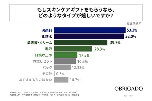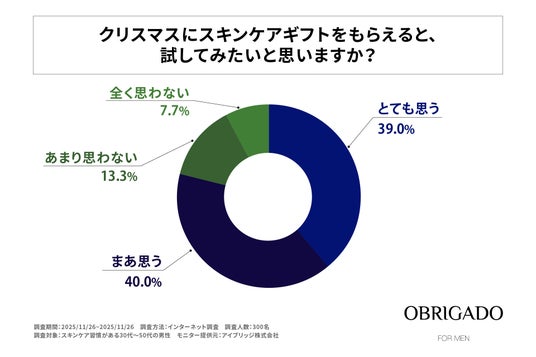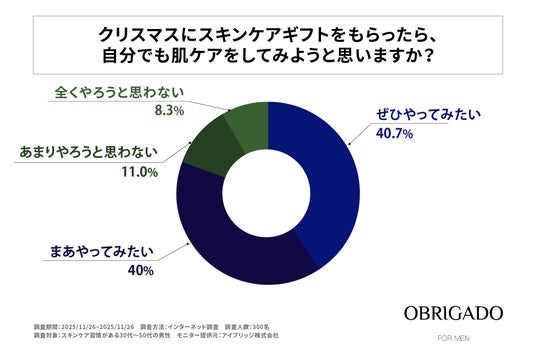 クリスマスにスキンケアを贈られる男性の約8割が「嬉しい」― ギフトがきっかけで“自分磨き”を始めたい男性が急増 ―「スキンケアギフト、男性はどう思う?」OBRIGADO(オブリガード)が本音調査を実施