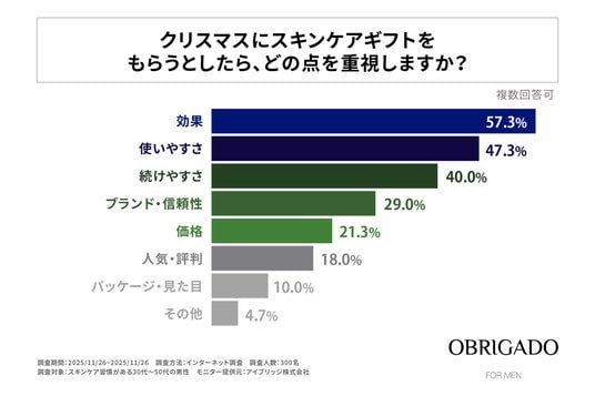 今回の調査は、クリスマスシーズンを控え、男性がスキンケアギフトをどのように受け止めるか、実際にどのアイテムをもらうと嬉しいと感じるか、そして使い続けてみたいと思うかなど、スキンケアギフトに対する意識の実態を明らかにすることを目的に実施されました。OBRIGADOは、男性向けスキンケアの認知向上やギフト選びの参考情報として、本調査を行いました。