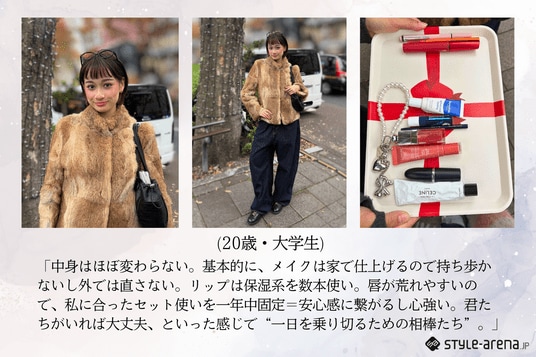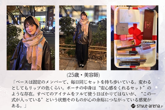また、25歳・美容師の人は、ポーチの構成は毎日同じで、変わるのはリップの色味だけ。全アイテムを毎日使うわけではないが、「この一式が入っているだけで安心」と語り、“私にはこれ”というマイルールがあることが伺えました。