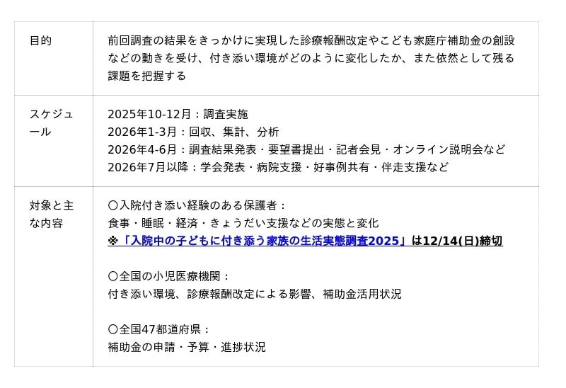 ■内容:全国の付き添い家族・医療機関・都道府県を対象に実施し2026年春に結果を発表予定