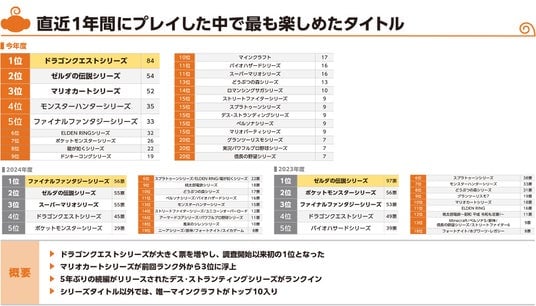 ~コンシューマゲーム市場において「直近1年間にプレイした中で最も楽しめたタイトル」はドラゴンクエストシリーズが1位~
