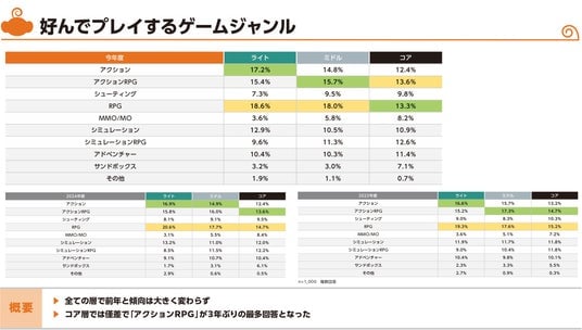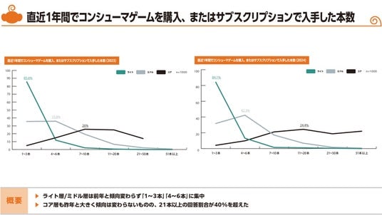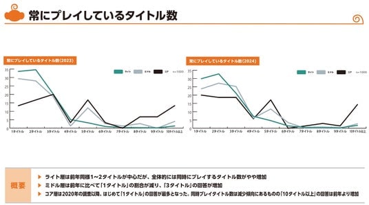一方、コア層では同時プレイタイトル数が減少傾向でした。「短時間で効率良く進められるが、やり込みは深い」といった、"お金を使って楽しめる要素の充実"で、複数タイトルを並行で進めることが厳しくなりつつあるとも推測できそうです。